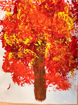 This is not high tech. It is not original and unique. It requires only paint, paper, water, a sponge, and a brush. But sometimes classic and easy is what makes a long-lasting impression. My beloved early elementary art teacher Mrs. B did this fall project with us and I STILL remember it. Of all the art projects from the 9 years that I had art classes in school, this one stands out and I was probably only 5 or 6 when I did it. Here it is: