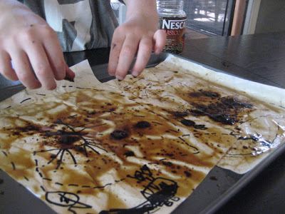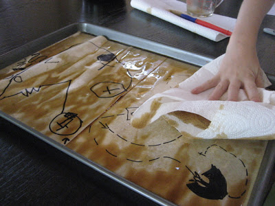 We needed brewed coffee or tea, instant coffee granules, a Sharpie (permanent marker), some plain white paper (I used computer printer paper), a baking sheet with a rim, some paper towels, and an oven: