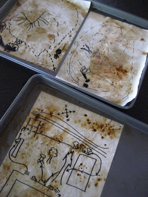 Well, I didn’t have any shellac on hand, but I have heard that similar results can be obtained with coffee or tea. So, we gave it a go. I followed the basic instructions for How to Antique Paper from Curbly blogger, DIY Maven. We then embellished a bit. Here’s what we did: