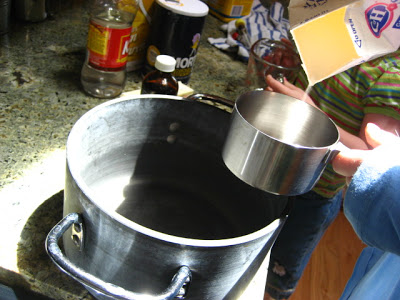 At this point quickly stir in your flavor and color should you choose to add any, then dump the very hot liquid onto a greased cookie sheet, or marble slab. I just buttered our granite countertop and that worked nicely. Warn the children that it is VERY HOT.