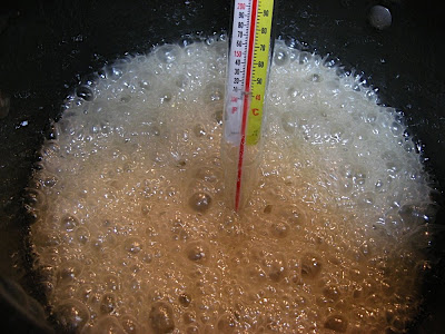 Once it boils, add a candy thermometer and stop stirring.