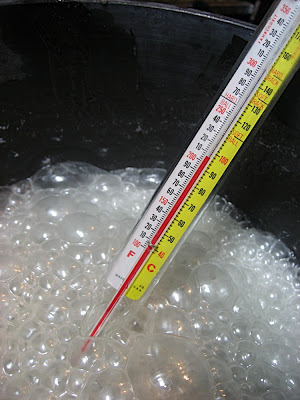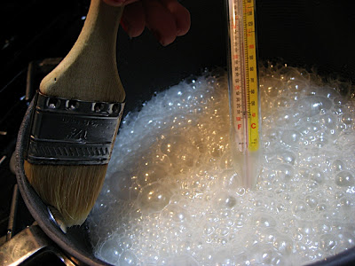 While the mixture boils, it is important to wash down the sides of the pan with warm water and a pastry brush. This prevents any crystallization on the side of the pan from falling back into the mixture and becoming a seed crystal which could also cause unwanted recrystallization of the sugar mixture.