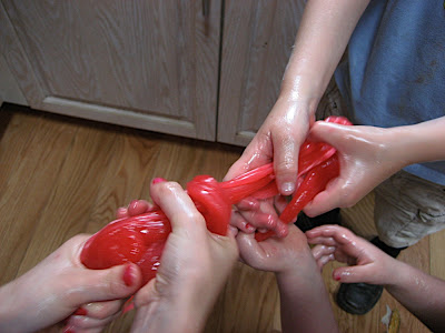 Have the children butter their hands (they loved this step), and when it is cool enough to handle, begin the pulling process. Have the children stretch it between them (warning - DO NOT DO THIS ABOVE A DOG. Our dog jumped up and bit some off!).