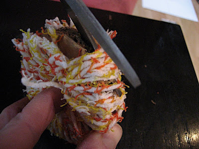 When you are through wrapping, cut the strands all the way around the edge of the doughnut with the scissor tips between the two cardboard pieces.