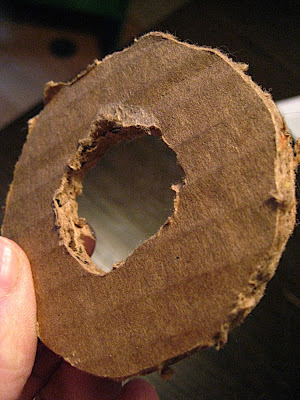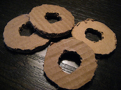 Cut two matching circles out of the cardboard. Next cut matching circles out of the middle of the original circles so you have a doughnut shape. (NOTE: Our cardboard was from an extra heavy box so I ended up using a dremel tool to cut these, but you really don’t need cardboard that is quite that tough!):