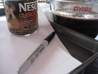 We needed brewed coffee or tea, instant coffee granules, a Sharpie (permanent marker), some plain white paper (I used computer printer paper), a baking sheet with a rim, some paper towels, and an oven: