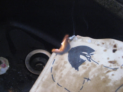 Light a candle and place it in the kitchen sink. The dry paper burns very well, so you’ll want water right there. You can also just drop the paper into the sink if the flame spreads too quickly. I was a bit overly-enthusiastic on my first go and burned a few apparently crucial areas of one of my daughter’s maps (sorry!):