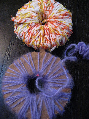 The width of the “ring” portion of your doughnut (distance between outer edge and start of inner hole) will determine the size of your pom pom (bigger band=bigger pom pom). Also, I would advise making your donuts a bit bigger than we did so that the middle hole can be bigger. A larger hole makes it easier to pass the yarn through.