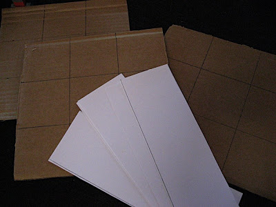 Using the ruler, I penciled a grid of nine approximately equal squares on each piece of cardboard. These became the bingo cards.