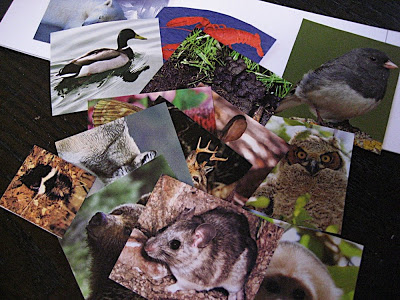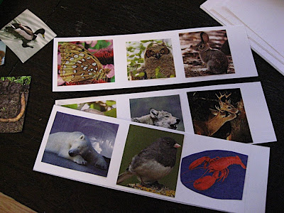 Finally, the really fun part. We searched the nature magazines to find some common animals to cut out, making sure that each animal photo would fit inside one of the nine squares on the card.