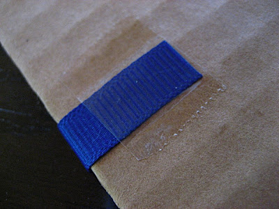 Next we cut some narrow ribbon in lengths just long enough to be slightly wider than the cardboard squares.