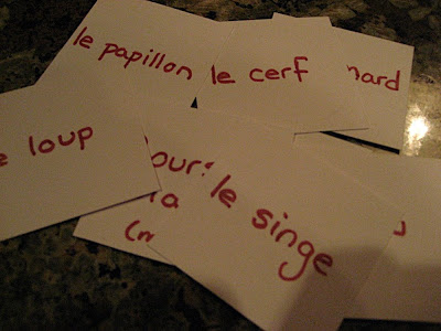 When the boards were done, we cut pieces of card stock into squares that were close to the size of our animal squares. I wrote an animal name in French on each card.