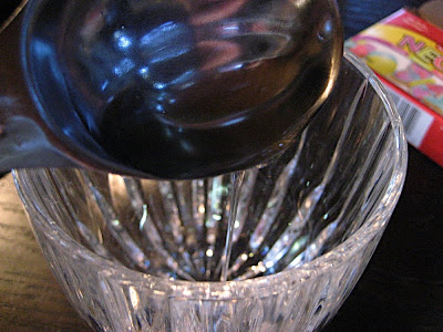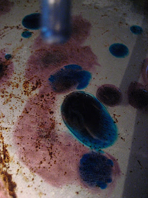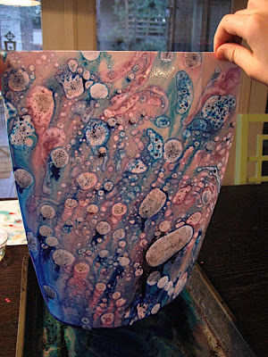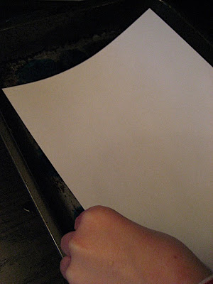 Pour the pulp mixture into a basin that is large enough for your deckle to lie flat on the bottom. Tip the basin a bit and slide your deckle in under the watery pulp.